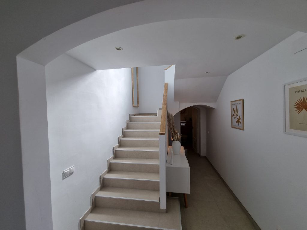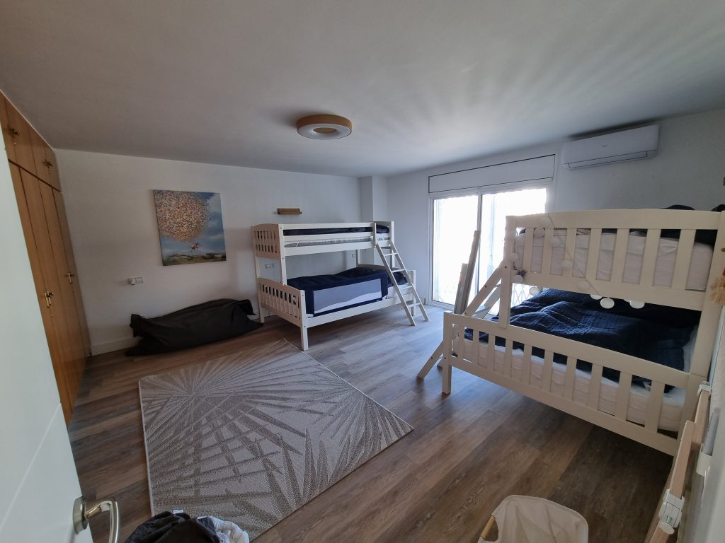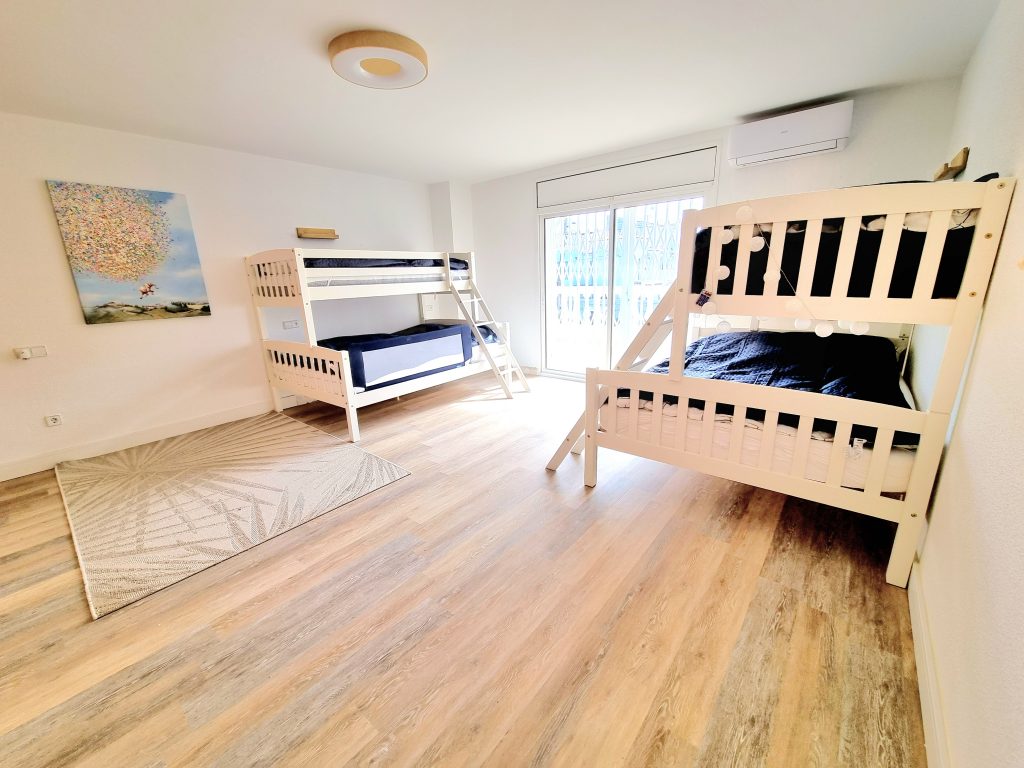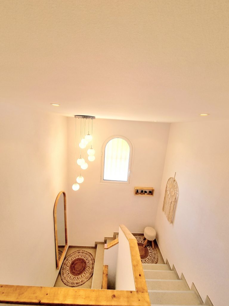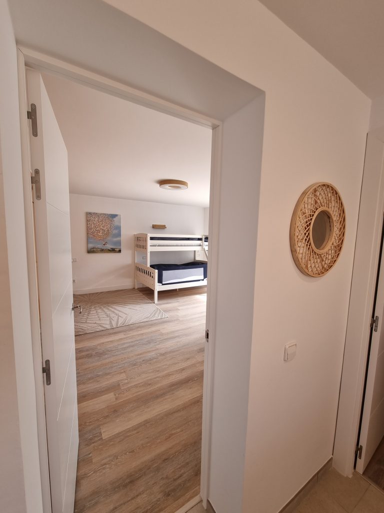 Nach betreten des Hauses befindet sich auf der linken Seite ein Bereich mit 2 Schlafzimmern, 1 Bad und Flur. Im EG befindet sich außerdem ein Gästebad sowie der Wohn-, Ess- und Küchenbereich mit direktem Zugang zum Außenbereich. Im oberen Geschoss befindet sich ein Weiterer Bereich mit 2 Schlafzimmern und eigenem Bad. Ein weiteres Schlafzimmer mit Bad „En Suite“ sowie ein ca. 35qm großes Zimmer mit Hochbetten. Alle Zimmer haben Bodentiefe Fenster und erlauben den Zutritt auf eine der 3 Dachterrassen. Alle Möbel sind sehr hochwertig und modern aber trotzendem gemütlich. Die Betten haben ein Maß von 180×200, die Hochbetten sind 140*200 und die obere Liegefläche 90*200.