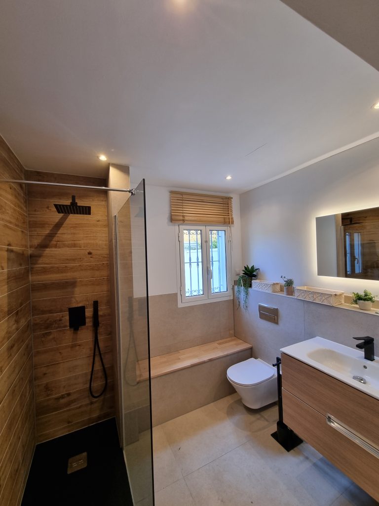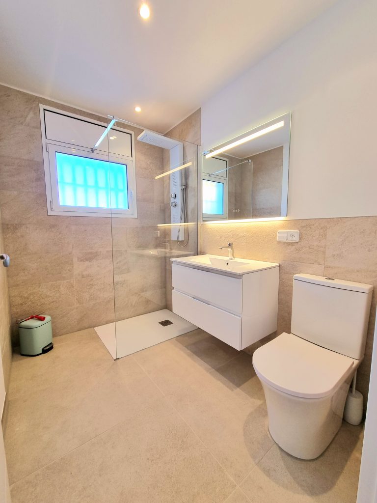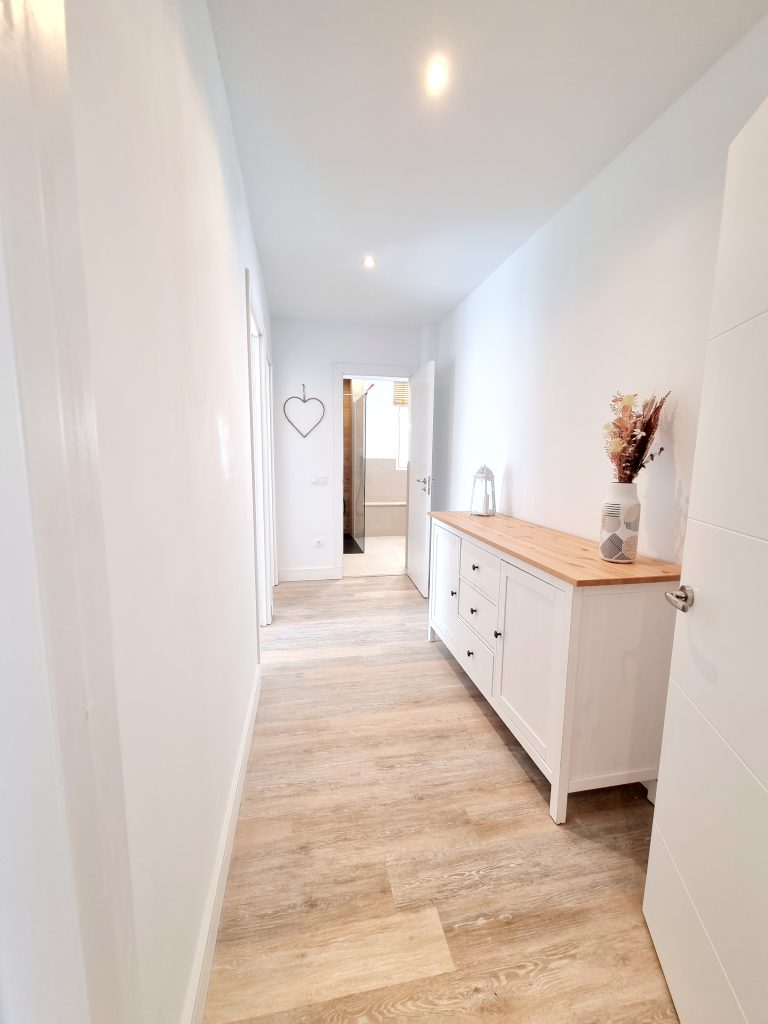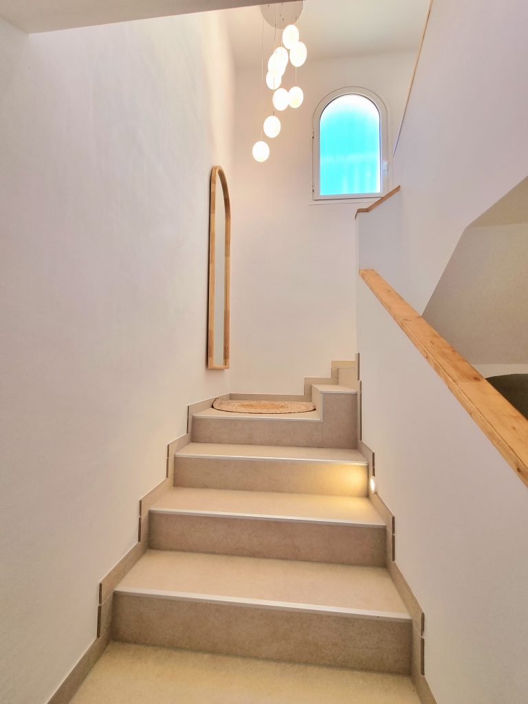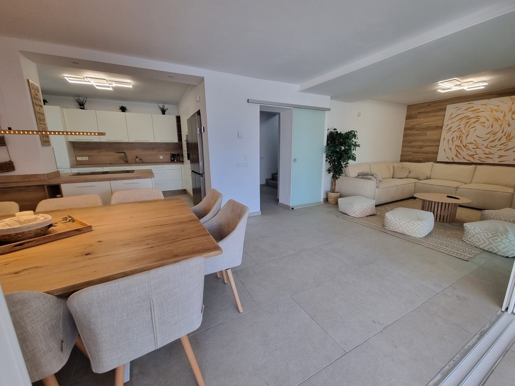 Nach betreten des Hauses befindet sich auf der linken Seite ein Bereich mit 2 Schlafzimmern, 1 Bad und Flur. Im EG befindet sich außerdem ein Gästebad sowie der Wohn-, Ess- und Küchenbereich mit direktem Zugang zum Außenbereich. Im oberen Geschoss befindet sich ein Weiterer Bereich mit 2 Schlafzimmern und eigenem Bad. Ein weiteres Schlafzimmer mit Bad „En Suite“ sowie ein ca. 35qm großes Zimmer mit Hochbetten. Alle Zimmer haben Bodentiefe Fenster und erlauben den Zutritt auf eine der 3 Dachterrassen. Alle Möbel sind sehr hochwertig und modern aber trotzendem gemütlich. Die Betten haben ein Maß von 180×200, die Hochbetten sind 140*200 und die obere Liegefläche 90*200.