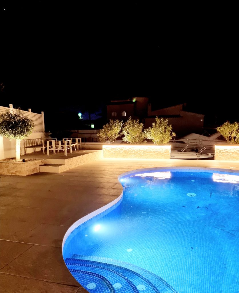 Der Pool hat eine Größe von ca. 8,5*4m. Am Abend genießen Sie die geschmackvolle Beleuchtung im ganzen Haus.
